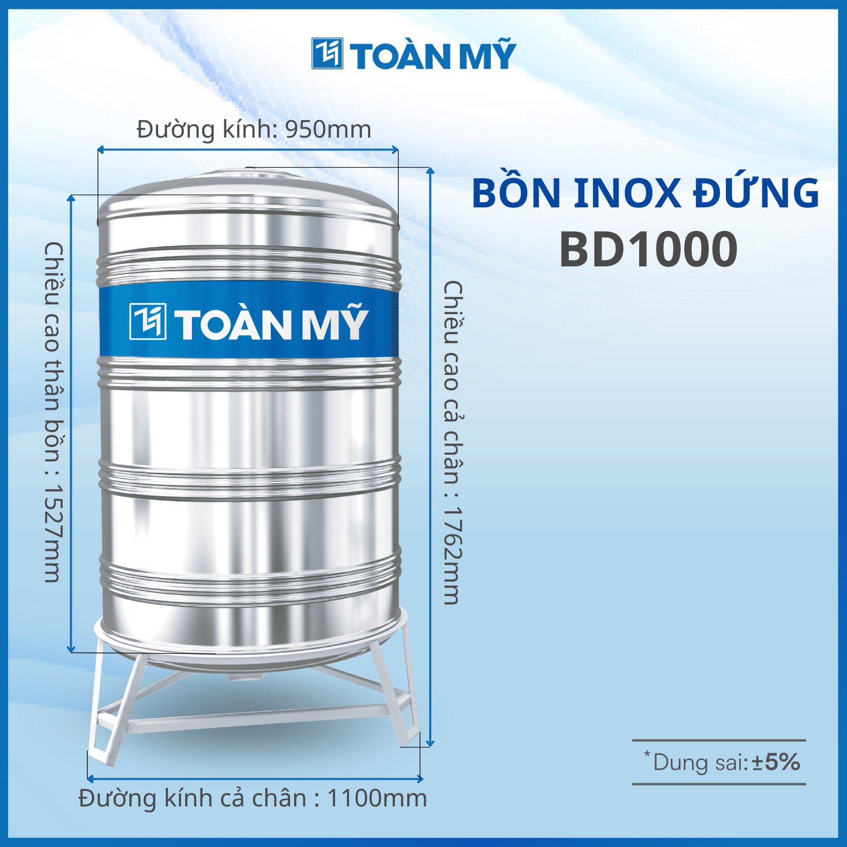 Bồn nước inox Toàn Mỹ được chế tạo trên dây chuyền công nghệ hiện đại, đáp ứng tiêu chuẩn khắt khe, mang đến giải pháp lưu trữ nước tối ưu cho hộ gia đình, khu dân cư đến nhà máy, trường học…